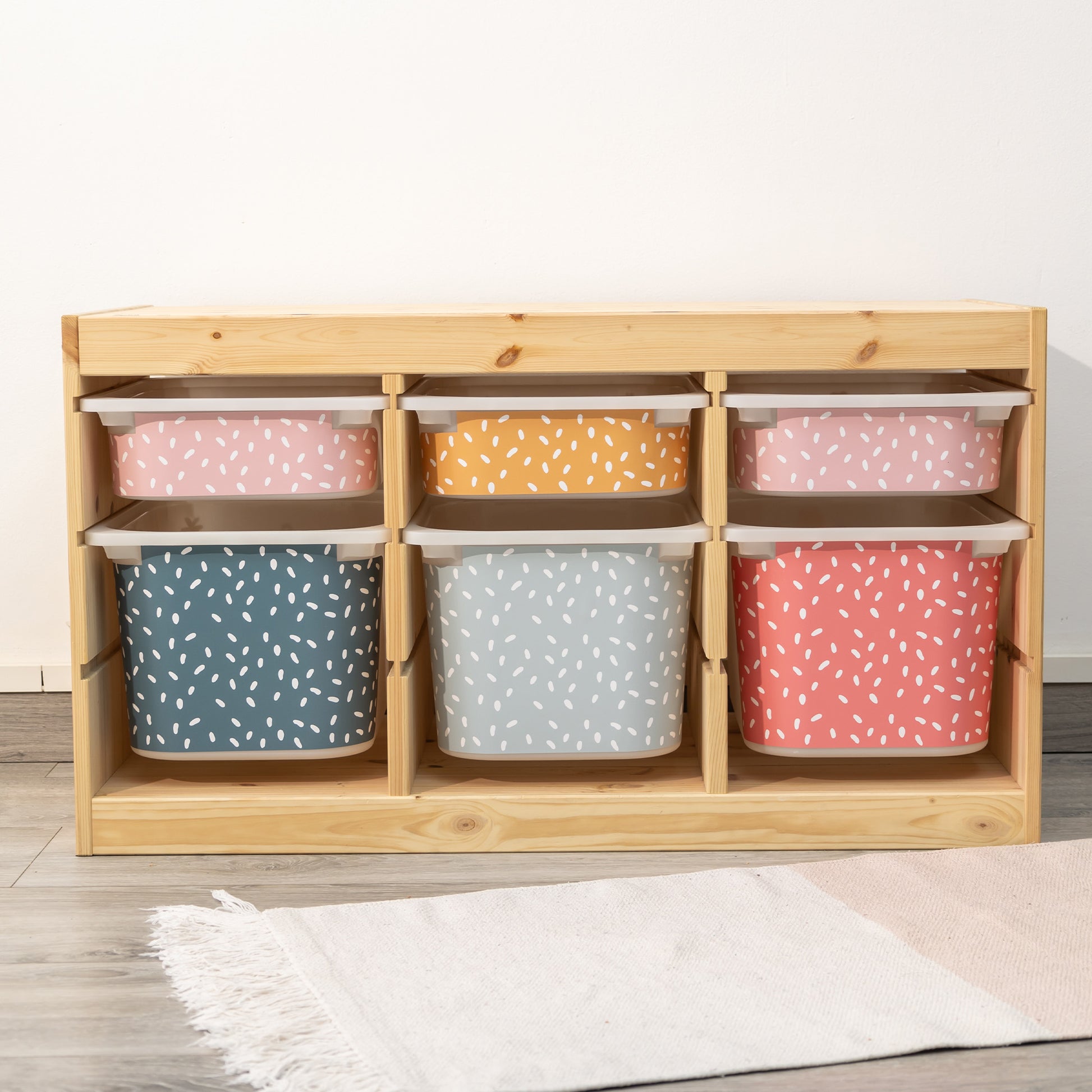 Refresh the drawer fronts of your IKEA TROFAST storage system with our Mini Irregular Dots self-adhesive vinyl stickers. These stickers are designed to fit perfectly on the drawer fronts and add a fun and unique touch to any child's room.