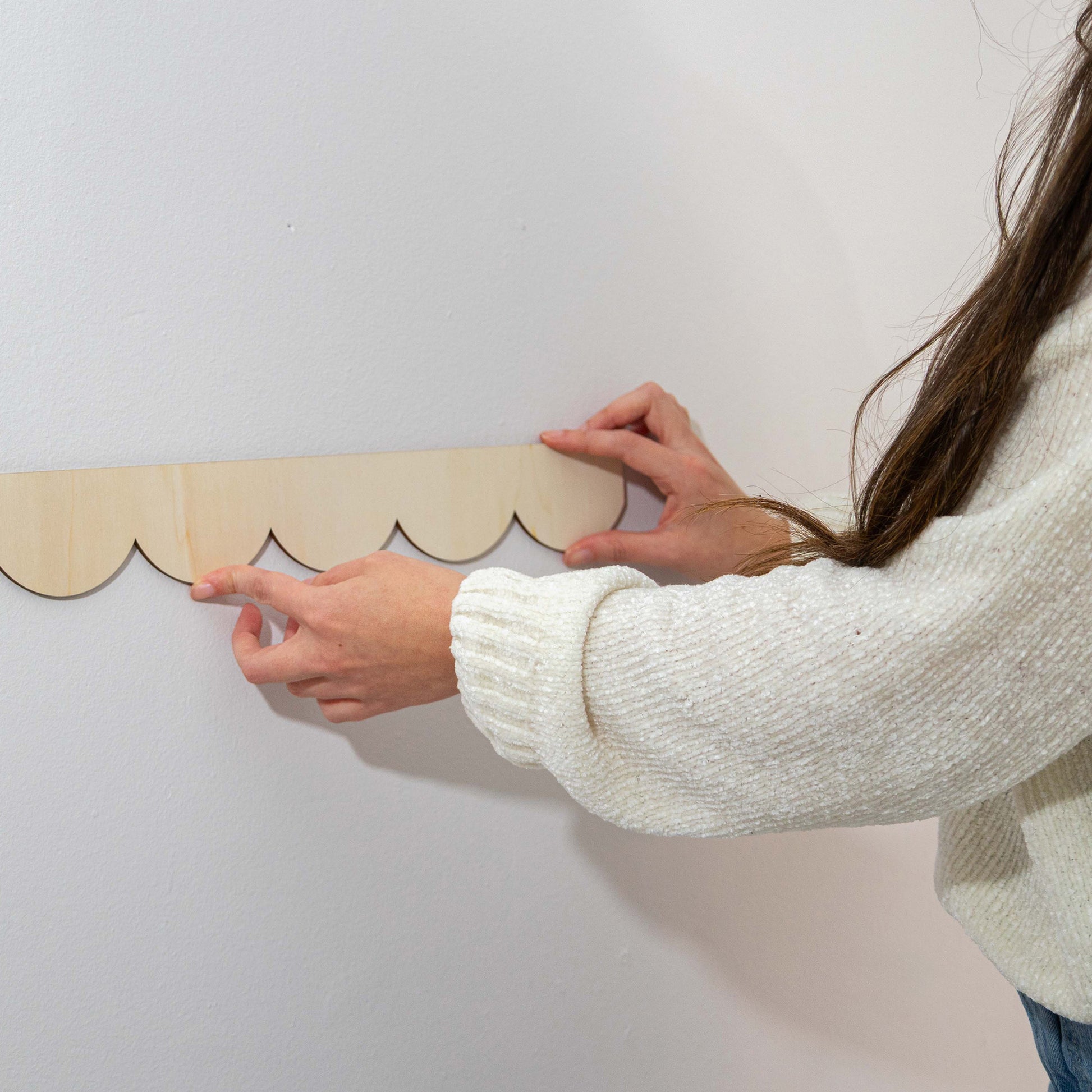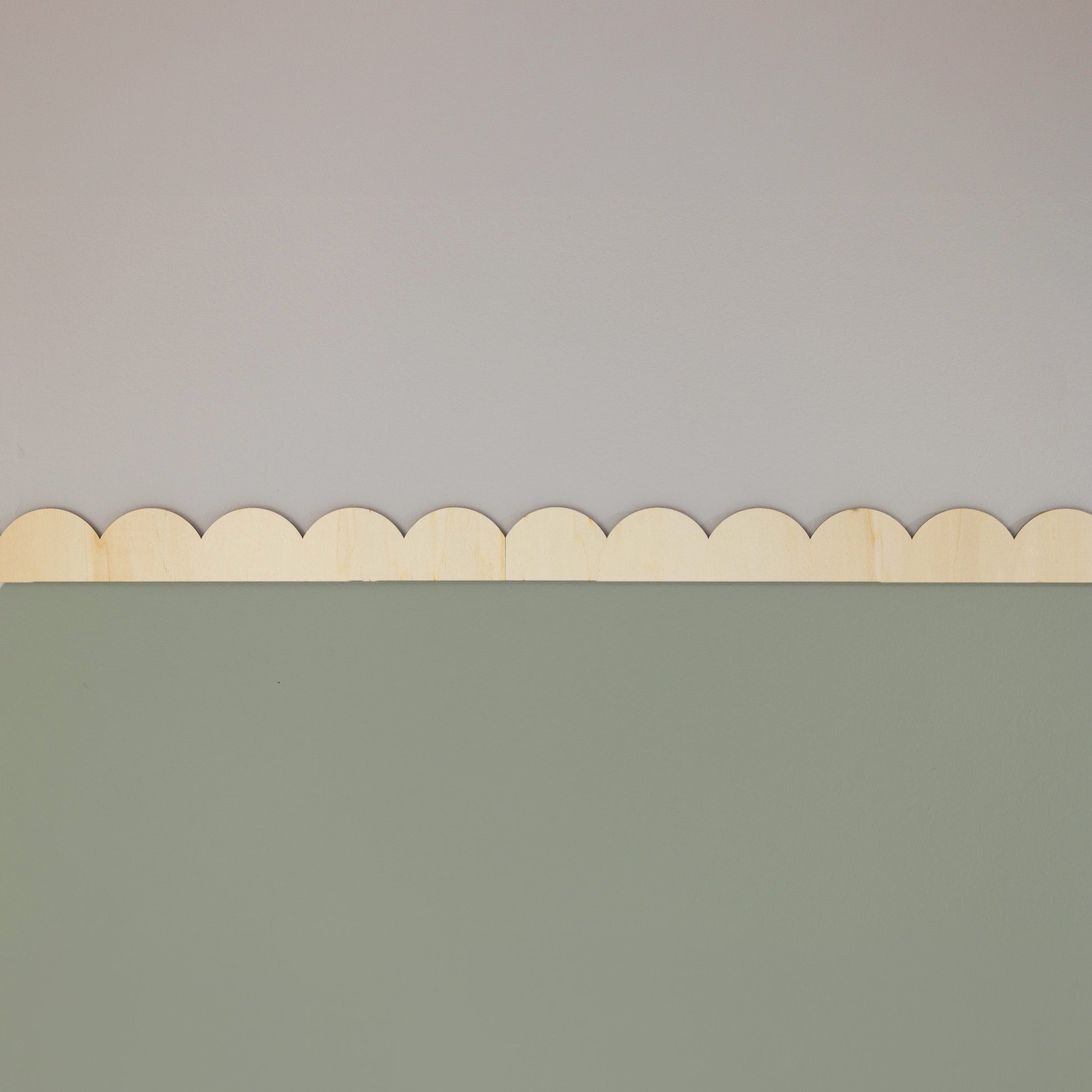 Define tus paredes con elegancia y carácter Nuestra cenefa de madera festoneada de 6 cm es la pieza perfecta para crear una separación visual con presencia y relieve. A diferencia de los bordes más finos, esta moldura tiene un diseño de onda completa que aporta un aire clásico y artesanal a cualquier estancia infantil.