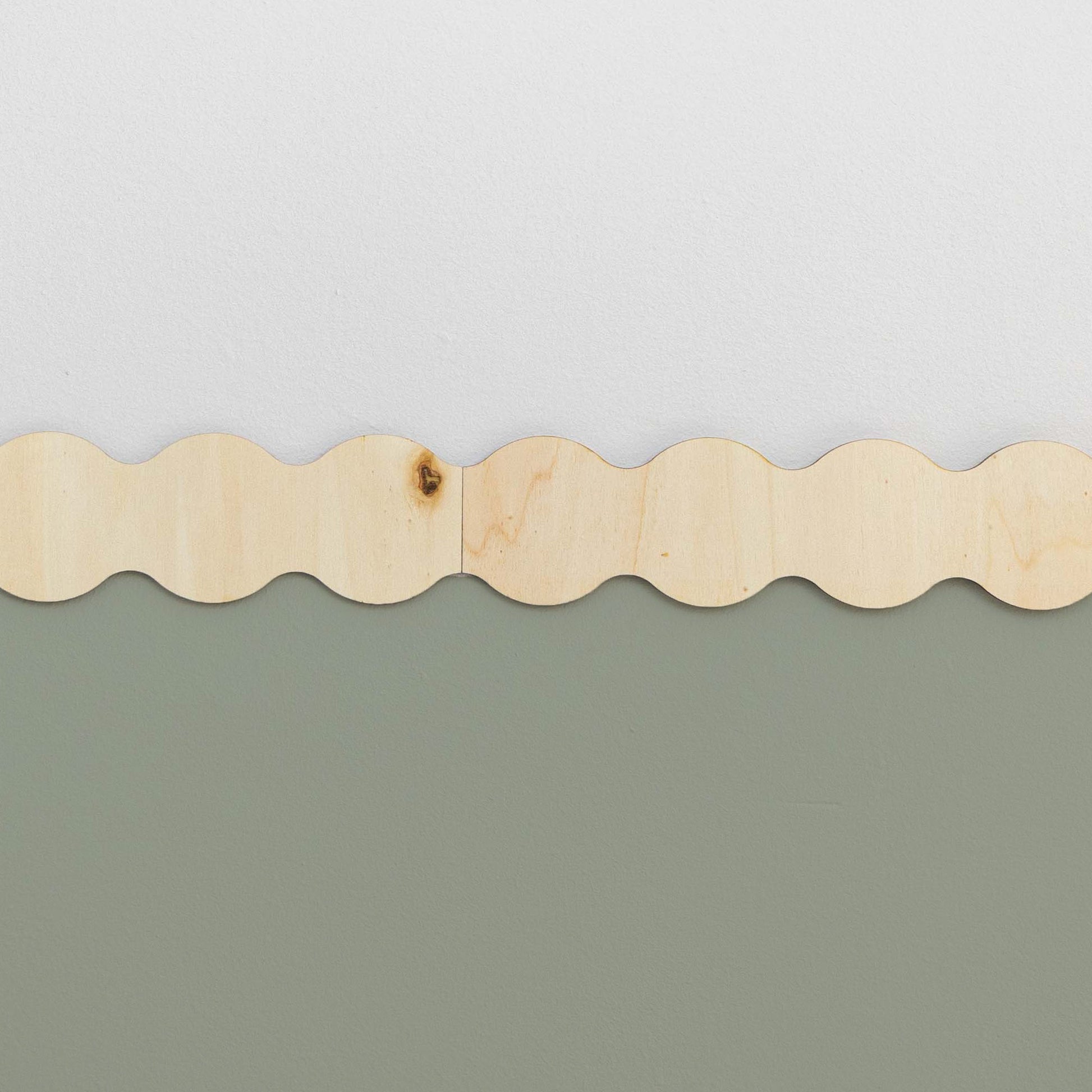 Suavidad y equilibrio para tus paredes Nuestra cenefa Modelo Nube presenta un diseño exclusivo de círculos unidos con transiciones redondeadas, creando una silueta de ondas fluidas que transmite calma y armonía. Con 7 cm de altura, es la medida perfecta para quienes buscan una decoración presente pero equilibrada, ideal para habitaciones infantiles con un estilo orgánico y moderno.